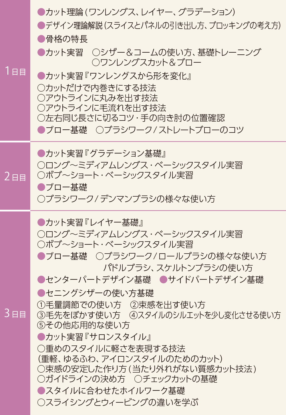 カットを最初から学びたい方、ブランクがある方、サロンスタッフの教育に携わる方、独立を前にもう一度基礎から学んでおきたい方、全ての方に安心して受講していただける内容です。 こんな方に是非受講をおススメします