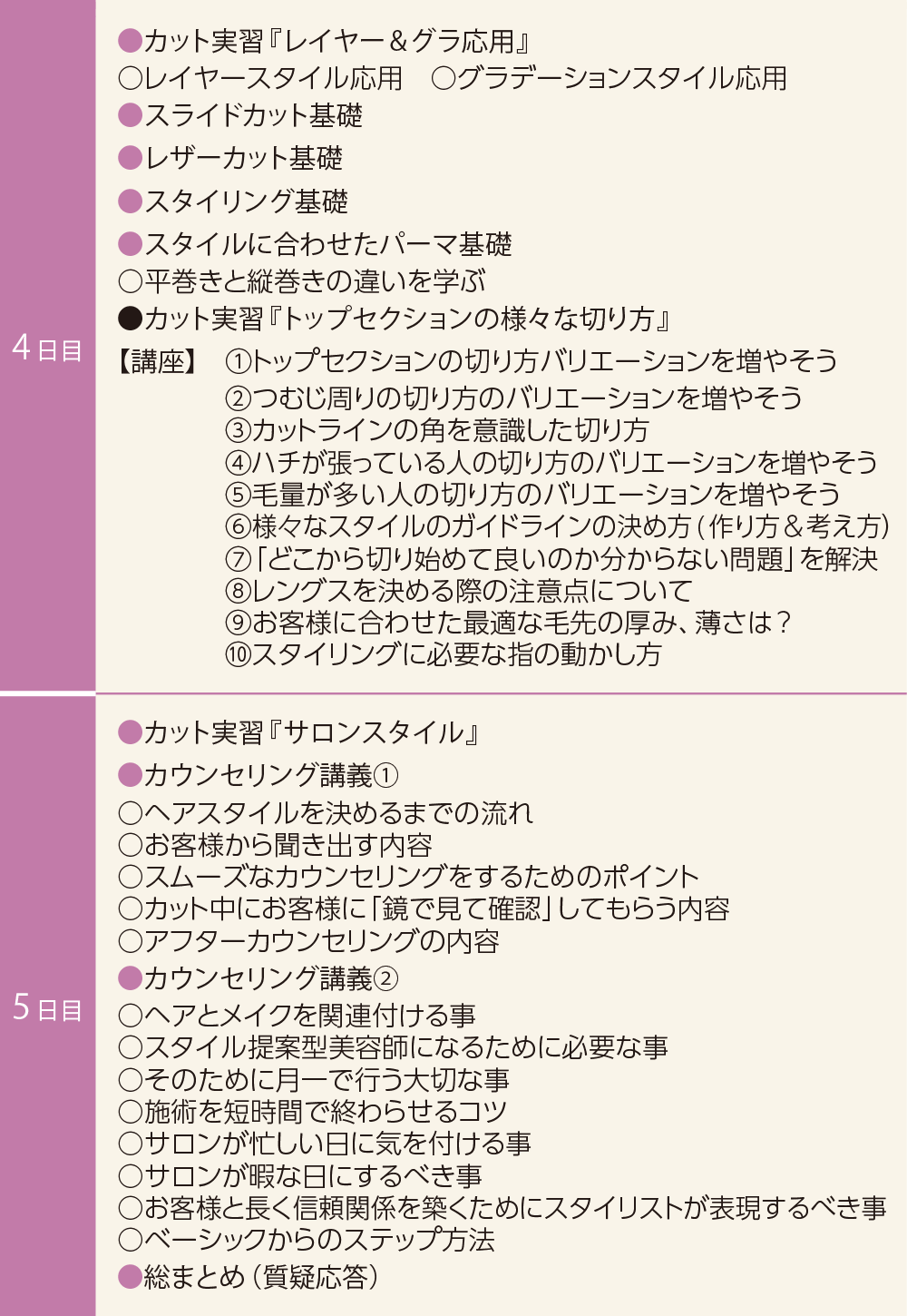 | 受講料 | ¥129,800(税込) ※宿泊なし ※食事(昼/夕)・カットウィッグスピロ103を5台含む ¥169,400(税込) ※宿泊あり ※食事(昼/夕)・ カットウィッグスピロ103を5台含む |